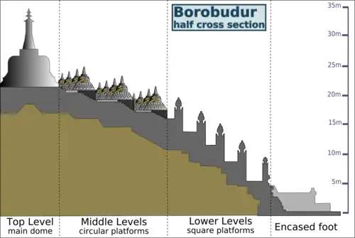 The monument's three divisions (the square terraces and central stupa at the peak are regarded as one division) symbolise the three realms of Buddhist cosmology, namely Kamadhatu (the world of desires), Rupadhatu (the world of forms) and Arupadhatu (the formless world).