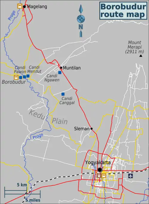 Between Yogyakarta and Magelang lies the volcanic Kedu Plain. This was clearly an important area in pre-10th century Javanese history as it contains a whole host of ruins (both Buddhist and Hindu) dating from the same era as Borobudur, and easily reached from there. If you have a car, the most accessible of these together make an interesting use of the late part of the day on the way back to Yogyakarta after you have seen Borobudur. Alternatively, if you are staying in the Borobudur area, rent a bicycle and explore these temples together with the verdant local countryside.