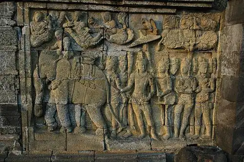 - The law of karma or Karmavibhangga. These are mostly hidden by the post-original construction masking at the foot of the monument. The reliefs tell stories and give examples of the nature of karma with depictions of both praiseworthy (including co-operative working practices and planned parenthood) and blameworthy (including torture, rape and theft) activities. The masking was disassembled in 1890 before being painstakingly rebuilt, and photographs were taken of the reliefs at this time. These photographs are displayed in the Borobudur Museum.
