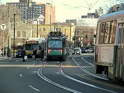 The "E" branch of the Green Line trolley is another great way into Mission Hill. Brigham Circle is the last stop along its dedicated right of way, while Fenwood Road, Mission Park, and Back of the Hill are all street level stops. Watch your step! All trolleys turn around at Heath St, the terminus of the E branch.
