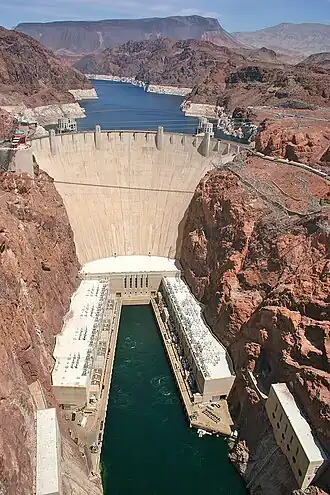 • 🌍 Hoover Dam, Nevada Route 172 (east of Boulder City), +1 702-494-2517, toll-free: +1-866-730-9097, . 5AM-9PM (dam accessible), 9AM-5PM daily (visitor center); 8AM-5:15PM (parking garage). Straddling the Colorado River between Nevada and Arizona, this was the world's largest dam when completed in 1935, and instrumental in generating power and providing irrigation via Lake Mead, which was created behind the dam. Even though through traffic no longer crosses the dam, instead crossing a bridge just downstream that opened in 2010, tourist traffic (and occasional employee traffic) to the dam can still be quite bad so plan your trip with extra travel time. $10 visitor center, with powerplant tour $15, in-depth tour $30, parking garage $10 at the visitor center & free parking on the Arizona side. OSM directions target=_blank