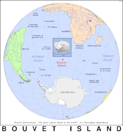 Bouvet Island or Bouvetøya is one of the sub-Antarctic islands, an uninhabited ice-clad place 2,600 km south-southwest of Cape Town. It has a good claim to be the world's most remote island: anywhere within 2,000 km is similarly desolate, such as mainland Antarctica. It lies 6,040 km south of the equator and is a dependency of Norway; for comparison Oslo main railway station is 6650 km north of the equator and can be cold but never ice-clad. That's testament to the chill of the Southern Ocean surrounding Antarctica, compared to the balmy North Atlantic.