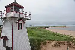• 🌍 Covehead Harbour Lighthouse, Gulf Shore Parkway (inside Prince Edward Island National Park). The Covehead Harbour Lighthouse is square, tapered, 8.2-metre (26.9-ft) tall wooden tower surmounted by a square, wooden lantern. It is located among the sand dunes of Prince Edward Island National Park of Canada, on the beach just to the east of the entrance into Covehead Bay. OSM directions target=_blank