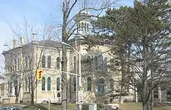 - π Peel Country Courthouse, 3 Wellington St E (at Main St S). Built in 1866, the courthouse features an onion-shaped copula. Next to it, at 7 and 9 Wellington, are the Peel County Registry Office (1890) and the Peel County Jail (also 1866), both of which today house the Peel Art Gallery, Museum and Archives.