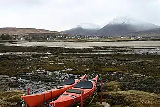 Broadford (Gaelic: An t-Γ€th Leathann) is a village straggling along the main road across Skye in the Scottish Inner Hebrides. All island routes converge here so you're bound to pass through it. Its name refers to the "broad fjord" of the bay, not the river crossing, but historically it meant only the western settlement around that crossing: Harrapool, Sculamus and Breakish are the eastern extension of Broadford. The population in 2020 was 1170.