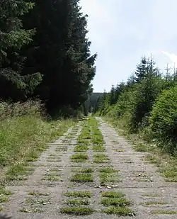 - 🌍 Km 5.0: junction at the former inner German border (about 795 m) - From here, there are two paths, about equally long, going in parallel to Dreieckigen Pfahl. During the Cold War this was the border between East and West Germany, now between the states of Lower Saxony and Saxony-Anhalt. Turn left in the junction to follow the Fahrweg on the Lower Saxony side, and turn right to follow the Kommenenweg on the Saxony-Anhalt side. The latter follows the East German border strip which still doesn't have much vegetation.