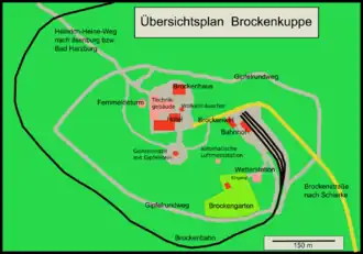 The East German authorities built a 3 m high wall around the summit, which was torn down at the reunification when the mountain reopened for civilians, and the route of the wall was turned into a walking path, the Gipfelrundweg (lit. "way around the summit"), about 1.6 km in length. There are good views around all of the mountain but the view to the north is particularly impressive. There are ten information signs along the route where you can learn more about the views, nature and culture. There are daily guided tours along the path (see the Brockengarten listing above).