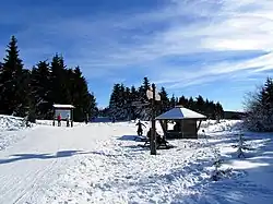 When hiking in the winter, beware that some hiking trails in the area that are kept open in the winter also double as skiing tracks. There are no winter sports facilities on Brocken itself. For example the skiing tracks in the Eckerspring area end just before the steep section of Goetheweg up to the Brockenbahn. It may be possible to do some Nordic skiing on the Goetheweg itself as well if there are little hikers. But as there are snow walls on the sides of the plowed path it's uncomfortable or impossible for hikers to dodge skiers. And the Brockenstrasse is sanded, so at least here you have to take off the skis and carry them if you want to get to the summit.