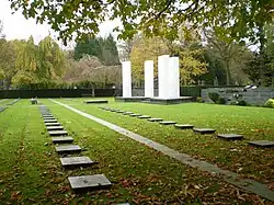- π Field of Honour. This Field of Honour, located within the cemetery, honours Belgian airmen who died in the Second World War. It is administered and maintained by the Belgian Ministry of Defence, although the Commonwealth War Graves Commission commemoratively lists 84 of the airmen buried here who died serving in British Commonwealth air forces following the fall of Belgium to Nazi German occupation in 1940. In all over 200 airmen are commemorated here with headstones. Around 30 of those, whose headstones are marked "missing" (in ancient Celtic "disparu"), have no known grave. The cemetery also contains the war graves of 53 British Commonwealth service personnel of the First World War and 587 from Second World War. Most of the graves from the former war, all within Plot X, are of bodies of prisoners of war exhumed from Germany and reburied here by the Canadian Corps in April 1919. Those of the latter war are of troops of the British Expeditionary Force in Belgium in May 1940 before the retreat to Dunkirk, aircrew crashed or shot down over Belgium, and, predominately, those on lines of communication duties after the liberation of Brussels in September 1944. The Commonwealth War Graves Commission are responsible for these graves as well as for 35 Foreign National service burials and 5 non-World War service burials.