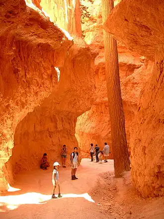 • 🌍 Peekaboo Loop. (5.5 miles / 8.8 km round trip). A trail shared with horses and leading through formations within Bryce Amphitheater. It is accessible from the Queen's Garden trail. OSM directions target=_blank