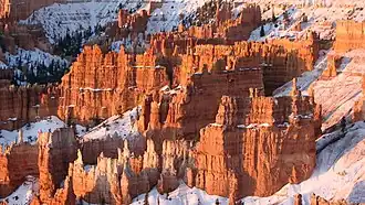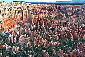 Bryce Canyon consists of a series of horseshoe-shaped amphitheaters carved from the eastern edge of the Paunsaugunt Plateau in southern Utah. The erosional force of frost-wedging and the dissolving power of rainwater have shaped the colorful limestone rock of the Claron Formation into bizarre shapes including slot canyons, windows, fins, and spires called "hoodoos." The varied colors of the rocks and rock formations contribute to the spectacular views.