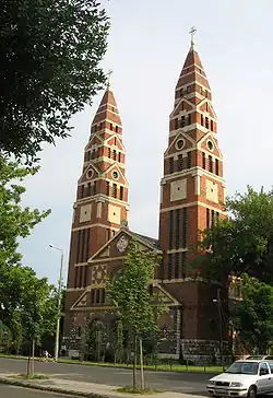 : Lehel tér take tram 14 to Béke tér), ☏ +36 1 3400666, beketer@citromail.hu. Masses M-W 07:30, W-Sa 18:00, Su 07:30, 09:00, 10:30 and 18:00. Built in Gothic-style. A Latin cross plan, three-nave church with a semicircular apse. It has a main tower with two smaller ones and also a Hussar tower. The bronze Stations of the Cross images made by a local artist. The pulpit was made of Rușchița marble (Caraș-Severin County, Romania). The three-manual organ made in 1942, by the Rákosfalva's (a district of Budapest/East_Pest) Rieger company. The jewel of interior is three triptych, which were made between 1939-1942, C. Paul Molnar works. The main altar paintings depicting scenes from the life of Saint Ladislaus.