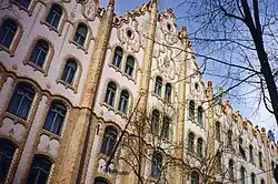 Arany János utca). Built in 1901, by Arch. Lechner Odon in Art Nouveau style. The Lechner's Art Nouveau features the Hungarian floral motifs and colorful ceramic tiles and majolica. The gables are decorated with golden beehives, as the gathering and saving symbols.
