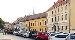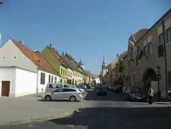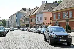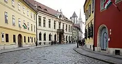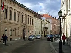 - 🌍 Dwelling Houses on Parade Square (Lakóházak a Dísz téren), I, Dísz tér, Tárnok utca (Dísz tér 16 ). Parade Square is a north to south elongated area, bordered by one- and two-storey hundred years old houses. Major houses of the square: Dísz tér 3: The two-storey building which the back facade oriented towards the Danube, the main facade facing on the square. In 1748, builder Marton Siegl erected a new two-story Baroque palace for Palatine Batthyány Lajos. After the World War II it was restored in its 18th century shape with a Baroque facade Above the balcony the Batthyány family coat of arms can be seen. Dísz tér 4-5: since 1686 Baroque buildings were erected. From this period have survived only in the downstairs rooms. In 1908 it was rebuilt in Art Nouveau style. In 1930s, the Papal Nunciature home. After the World War II damage, it was restored with a new, uncharacteristic facade. Dísz tér 9: two-storey Romantic house built in 1869. Ferenc Móra lived here, who was a Hungarian novelist, journalist, and museologist. Dísz tér 10: one-storey Baroque house built around 1760. Dísz tér 11: one-storey building with Classicist facade and Neo Baroque door with decorated window framing. Dísz tér 12: medieval house. In 1688 the mayor rebuilt, in 1850s again remodeled as a two-storey classicist building. At the beginning of the 20th century it was completely rebuilt, this time in Neo-Baroque style. Dísz tér 13: this one-storey house is probably the most beautiful building on the square. It gained its present shape during the 1815 reconstruction. The main ornament of its Classicist style facade is three small reliefs above the top row of windows depicting Greek and Roman mythological scenes. There is a beautiful wrought iron door in the doorway in front of the stairwell on the right.