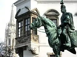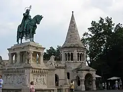 - 🌍 Equestrian Statue of King Stephen (Szent István király lovasszobra), I, Szentháromság tér (Szentháromság tér 16 ). King Stephen was the first king of Hungary (crowned about 1000). He was declared a saint for his efforts in bringing Christianity to Hungary. He carries the apostolic cross with two crossbars, symbol granted him by the Pope. The sculpture was made by sculptor Alajos Strobl, started the project in 1896 and completed it in 1906. Frigyes Schulek designed the Neo-Romanesque foundation for the statue. The foundation structure is decorated with reliefs, which commemorate a prominent moment of King Stephen's reign: the coronation scene, the introduction of the legislative act, the depiction of Vienna and the Austria-Hungary dualism, while on the back and east we see a series of scenes symbolizing the temple construction, where Stróbl depicted the aging Schulek master as the bearded, kneeling, model of King Stephen in the form of a master builder.