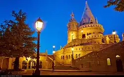 - 🌍 Fisherman's Bastion (Halászbástya), I, Szentháromság tér (Szentháromság tér 16 ). One of the best known monuments in Budapest. This is the large white tower and lookout terrace complex. It is one of the most important tourist attractions due to the unique panorama of Budapest from the Neo-Romanesque lookout terraces. It’s named after both the medieval fishmarket once nearby and the Guild of Fishermen who defended this section of the wall during past wars. The story is that different trades were responsible for defending different parts of the castle walls and that this section of the defenses was raised by the fishermen’s guild. In fact, the structure is a late 19th century fantasy built to add class to the area. That this is an invention does not detract at all from the attractiveness of the structure, nor from the impressive views of the river and Pest on the opposite side. Free to visit.
