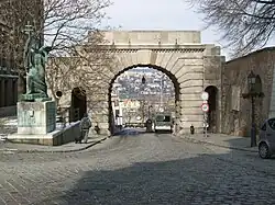 - 🌍 Vienna Gate (Bécsi kapu), I, Bécsi kapu tér (Bécsi kapu tér 16 ). During the Middle Ages it was called Szombat-kapu (Saturday Gate), because markets were held in front of it every Saturday. It has been called Becs kapuszu by the Ottomans. Later it called also as Jewish Gate. One of its two side-gates were removed in the early 19th century, and in 1896, the whole gate was demolished. The current gate was restored in 1936, commemorating the 250th anniversary of Recapturing of Buda. The rebuilt gate, designed by Jenő Kismarty-Lechner, has a more symbolical, rather than functional value. Inscriptions, ornaments and reliefs, including a running angel was sculpted by Béla Ohmann. Two parts of Bastion Promenade are connected on the top of the gate. Free to visit.