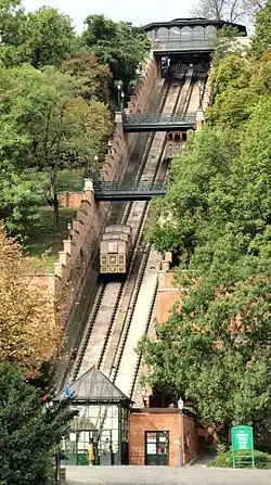 Another spectacular, but a bit pricey way to go up to the castle hill is to use the Castle Hill Funicular (Budavári sikló). It climbs up Castle Hill from Széchenyi Chain Bridge's Buda side to the Castle Palace by connecting 🌍 Clark Ádám tér (lower station) and 🌍 Szent György tér (upper station). As the funicular is rising up the hill, you get a beautiful view of Pest across the river. The funicular was opened on 2 March 1870, and has been in municipal ownership since 1920. It was destroyed in the Second World War and reopened on 4 June 1986. A feature of the funicular are the two pedestrian foot bridges which cross above it.