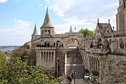 - The Fishermen's Bastion's main facade, parallel to the Danube, is approximately 140 m (460 ft) long. Its seven high-pitched stone towers symbolize the seven chieftains of the Hungarians who founded Hungary in 895. The current structure was built between 1895 and 1902, in Neo-Romanesque style, on the base of a stretch of the Buda Castle walls, by architect Frigyes Schulek, who was also responsible for the restoration of the Matthias Church. The north and south bastions, as well as the corridors form the bastion courtyard, are connected below by a staircase connecting the bastions on both sides, above, and on the level of the courtyards by a parapet. One of Schulek's greatest merits is that he transformed this area of the Castle Hill, which was essentially and originally for military purposes, into a peaceful promenade and a lookout object, forming a significant architectural unit of the Castle Hill, with the Matthias Church behind it.