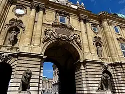 - 🌍 Lion's Gate (Oroszlános kapu), I, Lion's Court (Dísz tér 16 ). Two pairs of lions guard the monumental gate leading into Lion's Court. The four statues are the works of János Fadrusz from 1901. The animals standing on the outer side of the gate are menacing, while the inner ones are calm and dignified. One lion was broken in two pieces during the war, but it was recreated in the 1950s.