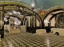 - 🌍 Palatinal Crypt (Nádori kripta), Within the Hungarian National Gallery (Dísz tér 16 ). Only by appointment. Burial place of the Hungarian branch of the Habsburg dynasty, founded by Archduke Joseph, Palatine of Hungary. It is the only interior part of Royal Palace which survived the destruction of World War II and was not demolished during the subsequent decades of rebuilding. It is located under the former Castle Church, built in 1768 (and finally destroyed in 1957), in the central wing of the palace.