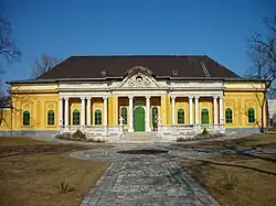 - 🌍 Gizella Mansion (Gizella-kastély), XVI, Egyenes utca 21-23 (Egyenes utcai lakótelep 276E ). Only from outside. This is a hillside mansion with outbuildings. Built circa 1790. The main facade of gardenside (to West) is a storey. The facade facing to yard (to East) has only ground floor. The building has covered with gable roof, the shell of its is plain tile. The Eastern side portico supported by four Tuscan columns. The facade of east is decorated with triangular tympanum which include a coat of arms with G.Z. initials. The builder was Earl János Festetich. There is a farm building with wooden porch and two wings, located on the northern part of the yard. The building had been in ruins for decades. Now inhabited again, is privately owned.