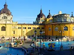 - 🌍 Széchenyi Thermal Bath (Széchenyi Gyógyfürdő), XIV, Állatkerti körút 9-11 (Széchenyi fürdő M1 ), ☏ +36 1 363-3210, szechenyi@spabudapest.hu. 06:00–22:00. It is one of the largest bath complexes of its kind in Europe and was the first baths to be built in Pest side. The ticket includes a number of wellness services in addition to the traditional balneological services. These include saunas, gyms, aerobic and group exercises in the pool. Ticket: 5500 Ft–6200 Ft.