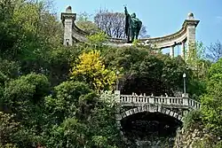 - 🌍 Saint Gerard Monument (Szent Gellért-szobor), I (Döbrentei tér 8E / Rudas Gyógyfürdő 7 19 ). The composition consists of two figures: the central figure is a 7 m (23 ft) high statue of Saint Gerard, made by Gyula Jankovits, while the side figure depicts the converted pagan Hungarian knight, the work of Aladár Gárdos. The ensemble of sculptures is surrounded by a semicircular “hall”, an arcaded building, the composition was designed by architect Imre Francsek in 1904. The overall picture is completed by a waterfall.