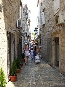 - Stari Grad (Old Town) (on the peninsula in Budva center). The old town of Budva lies on a little island that was linked to the land by a sandbar and in time turned into a peninsula. It is surrounded by ramparts originating from the 15th century including a medieval fortification system with city gates, defense walls and towers. The Old Town consists of narrow streets and alleys and small squares with precious monuments of different Mediterranean cultures that have marked the development of this town. You can enter in Old Town from one of five entrance doors.