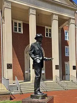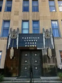 The Art Deco splendor of the Harrison County Courthouse. - 🌍 Harrison County Courthouse, 301 W. Main St. (2 miles [3.4 km] off the Buffalo-Pittsburgh Highway via West Main and West Pike Streets). It post-dates the Buffalo-Pittsburgh Highway era by a few years — the cornerstone reads 1931 — but the Harrison County Courthouse is the kind of sight that will leave Art Deco aficionados with mouths agape. The stylized chrome eagles and projecting cylindrical lighting sconces flanking the black granite-faced entrance, the pair of circular reliefs just below the roofline depicting the scales of justice, and the exquisite lettering on the sign all combine to exemplify the style to tremendous effect. Clarksburg-based architect Carlton C. Wood supervised the design. Also still standing, somewhat controversially, in front of the courthouse is Charles Keck's bronze equestrian statue of Confederate general Thomas "Stonewall" Jackson, a local native.
