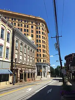 - 🌍 Goff Building, 321 W. Main St. (2 miles [3.4 km] off the Buffalo-Pittsburgh Highway via West Main and West Pike Streets). Standing nine stories in height and boasting an extraordinarily exquisite French Renaissance Revival design, the Goff Building is the last (and, many say, the grandest) of the five downtown Clarksburg buildings commissioned by Nathan Goff: it was erected in 1911, at which time its namesake was serving as a judge on the U.S. Circuit Court. Architect Frank Pierce Milburn patterned the design of this H-shaped early skyscraper after a pair of Classical columns, with a "base" comprising a row of storefront windows separated by engaged Tuscan pilasters, vertical rows of windows framed by Gibbs surrounds making up the "shafts", and an ornate mansard-style roof as the "capital". The Goff Building originally housed shops and a bank on its ground floor and offices above; it's now vacant and has spent the past few years passing through the hands of a number of owners with diverse plans for redevelopment.