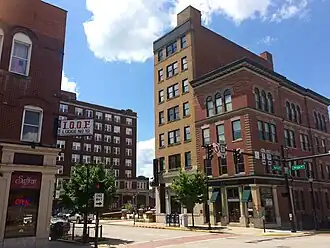 After about a mile (1.8 km), North State Street veers to the left and becomes West State Street. Then, after its intersection with Erie Street, it changes names again — to East State Street. Continue straight.