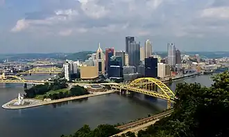 Where to head next? For starters, Pittsburgh's strange absence from the route of the auto trail to which it gave its name makes it a natural side trip for travellers along the Buffalo-Pittsburgh Highway. It wasn't too long ago that the Steel City was held up as an example of urban miasma, a place of shuttered storefronts, ramshackle slums, and gloomy desperation whose economic lifeblood had been drained by America's late 20th-century deindustrialization. But nowadays, Pittsburgh is the poster child for an altogether different phenomenon: the incipient rebound of the so-called "legacy cities" of the Rust Belt into trendy, desirable, and above all, affordable havens for folks priced out of the big coastal megacities. And it has much to offer the tourist, too: fine dining, picturesque historic architecture, big-league sports, worthwhile cultural attractions. 1920s-era travellers would have accessed Pittsburgh via the William Penn Highway or the Lincoln Highway as described above, but if you want to cheat and take the modern-day shortcut, hop on westbound Route 30 at Mount Pleasant Road in Greensburg, drive nine miles (14.7 km) into Irwin, then take the Pennsylvania Turnpike (I-76) west to the Penn Lincoln Parkway (I-376), altogether a 45- to 60-minute drive depending on traffic.