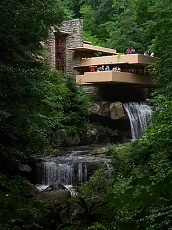 - 🌍 Polymath Park, 187 Evergreen Ln., Mount Pleasant Township (5½ miles [8.8 km] off the Buffalo-Pittsburgh Highway via Kecksburg Road, Claypike Road, and Evergreen Lane), toll-free: +1 877-833-7829. Tours offered daily except W, Mar-Dec; exact schedule varies throughout the season; consult website for details. Polymath Park is home to two of what are among the last buildings ever designed by Wright, both originally erected elsewhere only to be dismantled and moved to this 125-acre (51 ha) site in Mount Pleasant Township later on. The Donald C. Duncan House was the first to come to Polymath; one of about a dozen extant examples of the prefab modular houses Wright designed in conjunction with Marshall Erdman, it was built in Lisle, Illinois in 1957 and moved here in 2002, and is today one of, if not the only Frank Lloyd Wright house that accommodates overnight guests (up to four at a time). The R. W. Lindholm House, a 1952 Usonian originally located in Cloquet, Minnesota (where it was also known as Mäntylä, Finnish for "house among the pines"), followed fifteen years later. In addition to the foregoing, Polymath is also home to the Balter and Blum Houses, built in the 1960s by architect Peter Berndtson, a former apprentice to Wright; these were the original two houses on the property. One-hour, three-house tours $26; children under 9 not admitted. (The Blum House now contains the onsite Treetops Restaurant and is thus not open for tours as such.) Overnight lodging at the Duncan House $399/night M-F, $425/night Sa Su; children under 10 not admitted; see website for further details.