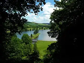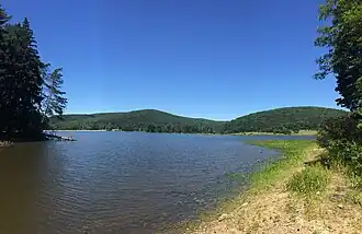 - ...or, if you prefer, make a left at that intersection and detour about four miles (6.5 km) east via State Route 857 to get to 🌍 Cheat Lake. Better known as Lake Lynn during its earliest years of existence, this 13-mile-long, 1,750-acre (21-km-long, 700-ha) reservoir along the Cheat River just south of the state line would have been a brand-new sight for auto trail-era motorists: it was in December 1925 when the first water finally flowed over Lake Lynn Dam after a decade and a half of construction, and the lake took most of the following winter and spring to fill. Unlike the Kinzua Dam which you passed by earlier, Lake Lynn Dam was conceived as a hydroelectricity project, not a flood-control measure, and to this day it provides 52 megawatts of power to the surrounding region. But the secondary recreational potential of the lake was evident from the start: in the early 1920s, even before the dam was complete, the West Penn Power Company had already built a series of cabins and cottages on what would soon become its shore, ready to be rented out as a perk for its workers. At first, Cheat Lake did indeed prove a popular destination for camping, hiking, boating, and (especially) fishing, but soon enough the dark side of the region's industrial economy reared its ugly head: the pollution dumped into the river by area coal mines, iron works, and tanneries that used to get washed downstream instead pooled in the lake, and by the 1970s it had been reduced to a foul-smelling, murky orange soup, with most of the wildlife in the surrounding woods long extirpated and only the hardiest species of fish left in the acidic waters of the lake itself. Cheat Lake has come a long way since then, though: a series of mine blowouts in the '90s finally spurred local conservationists into action, and today the water has been cleaned up enough to allow fish populations (especially yellow perch and smallmouth bass) and recreational opportunities to teem once again. If you'd like to try your luck, the Cheat Lake Anglers' Bass Club generally hosts a handful of open-to-the-public tournaments a year; check out their website for more information. And if Cheat Lake sounds like a place you'd like to linger for more than just the day, you can camp only a few minutes' drive away at 🌍 Coopers Rock State Forest (which also boasts majestic scenic views over the Cheat River canyon): primitive sites at the Rhododendron Campground go for $22/night during the high season, while the ones at McCollum Campground offer electric hookups for $10 more.