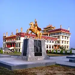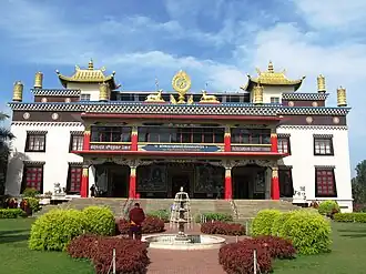• Namdroling Monastery. Is located at 4th camps, and with around 3,000 monks is the largest Nyingma monastery outside of Tibet. Nyingma Monastry is also known as Golden Temple; this name was given by the tourists. It is especially famous for its three copper and gold plated statues of Buddha (one 60 Ft. high and the other two 58 Ft. high) located in the Golden Temple. In accordance with the Vajrayana Buddhist tradition, sacred scriptures and stupas have been placed inside these statues as a means of consectration. This monastery is popular with local Tibetans who attend rituals ceremonies (pujas), and visitors are very welcome to stroll around the monastery grounds and may freely turn the prayer wheels and circumambulate the stupas. According to Tibetan belief, turning prayer wheels disseminates the prayers to the five directions. 'Wind Horses' (lungta), which are flags enscribed with prayers, have the same function.
