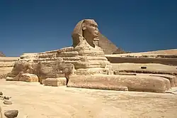 • 🌍 Great Sphinx of Giza. Like pyramids, sphinxes (ancient and modern) are found in many lands; this one is specifically the Great Sphinx of Giza. It's a single block of sandstone 45 m long by 22 m wide, bearing a man's head upon a lion's haunches. It is understood, by mainstream archeologists, to have been carved out of the bedrock in the reign of Khafre, bears his likeness, and represents a guardian spirit of the necropolis. Its original name is unknown but it was variously dubbed "Horus of the horizon" for the sun god or Abu el-Hol ("Father of Terror"). We know it by its Greek name Sphinx, which may mean "strangler" (as a lion crushes the neck of its prey, or the fate of those who failed to answer its riddles), or may simply mean "carved from living rock". Being solid, it has no inner passageways.