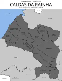 The municipality of Caldas da Rainha includes not only the city of Caldas da Rainha but also numerous surrounding rural communities. Beyond the two freguesias (civil parishes) that make up the city, the municipality has 14 rural civil parishes, each containing various settlements. In 2013, the 16 freguesias became 12 following a controversial nationwide local government reorganisation.