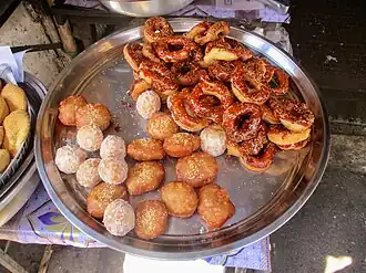 - Prawn cakes (កំពិសចៀន, kompis chean) — another popular street food snack made from a mixture of rice flour and prawns fried in oil in a pan and eaten freshly fried by dipping in a mixture of lime juice, ground black pepper and salt.