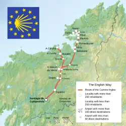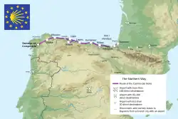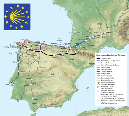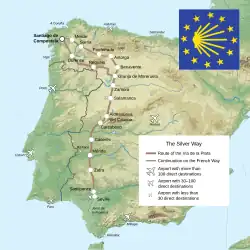 At the end of the route, Santiago de Compostela (SCQ IATA) offers flights to several domestic destinations, but only to a few international destinations within Europe. For direct international flights it's often more convenient to take a bus from Santiago to the Porto airport (OPO IATA or take a high-speed train from Santiago to Madrid and fly from there (MAD IATA). Both journeys take about 3 hours.