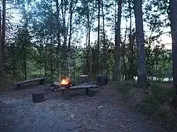 A campfire is a controlled outdoor fire, lit to provide lighting, warmth, deterrent of pests and aggressive animals, opportunities for outdoor cooking, and a priceless sense of community during camping.