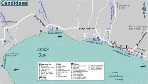 - Legong Restaurant, Jl Raya, Candidasa, β +62 363 41052. 11:00-21:00. Good quality local food and a nightly Legong dance performance to accompany dinner.