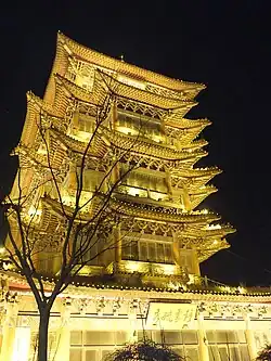 - 🌍 Qingfeng Building (清风楼 (沧州)), Jiefang West Road, Yunhe District. It is a modern reconstruction of a building constructed in the Jin Dynasty (266–420 AD). It was built in 1992, with 5 floors and a height of 30 m on the bank of the Grand Canal. It is an important symbol of Cangzhou City. The first floor displays historical and cultural materials of Cangzhou City. The top floor is an observation deck and the exhibition hall of modern Cangzhou achievements. The remaining three floors are teahouses that display ancient Qingfeng Tower Poems and history.