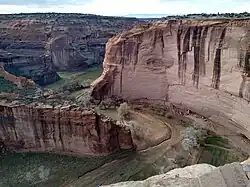 The national monument comprises three canyons. Canyon del Muerto and Monument Canyon join to form Canyon de Chelly. At its mouth, the canyon floor is broad and flat. There is sufficient water for patches of lush vegetation. The canyon walls rise steeply for about a thousand feet.
