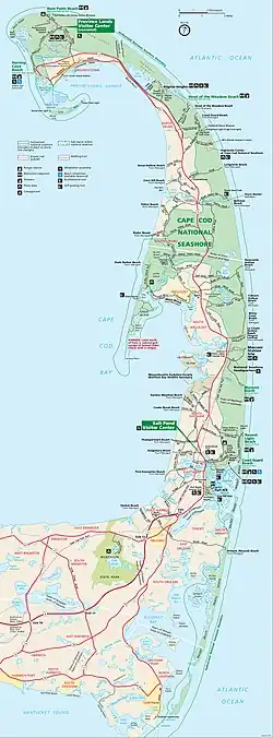 - 🌍 Province Lands Visitor Center, Race Point Road (Provincetown), ☏ +1 508 487-1256. 9AM-5PM daily. Open seasonally from mid-April through mid-October. Perched high atop a prominent sand dune, an observation deck provides a 360-degree view of the Province Lands dunes, the Outer Beach and the Atlantic Ocean. From this location you can see Race Point Ranger Station, Race Point Beach, the Old Harbor Life-Saving Station and the Pilgrim Monument in Provincetown. Exhibits about local plants and animals and the Pilgrim's landing in Provincetown are featured. Five short films daily on a rotating schedule in an indoor theatre. Bookstore with books, tapes, videos, toys and gifts related to Cape Cod. Free.