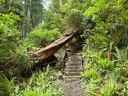 Cape Scott has some excellent examples of old-growth forest, including Sitka Spruce over 3 metres in diameter, and Western Red Cedar of similar sizes. Examples of these trees can be found throughout the park, including on the easy hike to đ San Josef Beach. About 20 minutes north of the đ Eric Lake campsite is a Sitka Spruce that measures more than 7 metres in circumference.