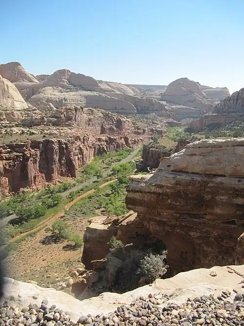 - Cohab Canyon (one trailhead lies right on the road outside the Fruita campground in a well-marked place, the other trailhead is on Highway 24 across the Hickman Bridge trailhead, also well-marked). One of the most popular trails, this one-way, 1 3/4 mile trail connects Highway 24 and the Fruita campground by way of a gorgeous canyon littered with side slot canyons and small holes in the rock, begging to be explored. At the campground trailhead there is a series of switchbacks for 1/4 mile, the most strenuous part of the hike. Halfway there is a side trail leading to a north and south overlook of Highway 24 and the nearby orchards. The north overlook rests on a sheer cliff hundreds of feet from the ground.