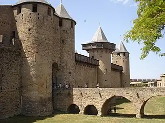 - The Cité de Carcassonne, a medieval fortress settlement with a history that exceeds two and a half thousand years. Picturesque fortifications (over 3 km of walls with 52 towers, Robin Hood: Prince of Thieves was partly shot here) were reconstructed by Viollet-le-Duc in the 19th century but, as with most monuments reconstructed in those times, authenticity was not the main objective. It is listed in the UNESCO World Heritage List.