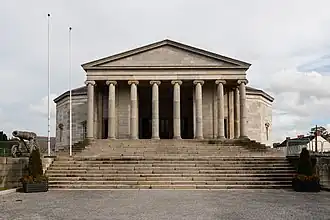 - π Carlow Courthouse, at the junction of Dublin St and Athy Rd, looks like it wants to be on a banknote. It's a neo-classical design, modeled on an Athenian temple, and completed in 1834. The Russian cannon in front was a trophy of the Crimean war. Refurbished in 2002, it's always been a courthouse; in the early 20th century the County Council shared the premises before moving to their own offices.