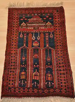 - Prayer rug. Prayer rugs, typically just large enough for one person to kneel on (though there are some designed for multiple worshippers) and usually with either a tree-of-life or an arch design, are quite common across the Islamic world. They are also used by some Christians.